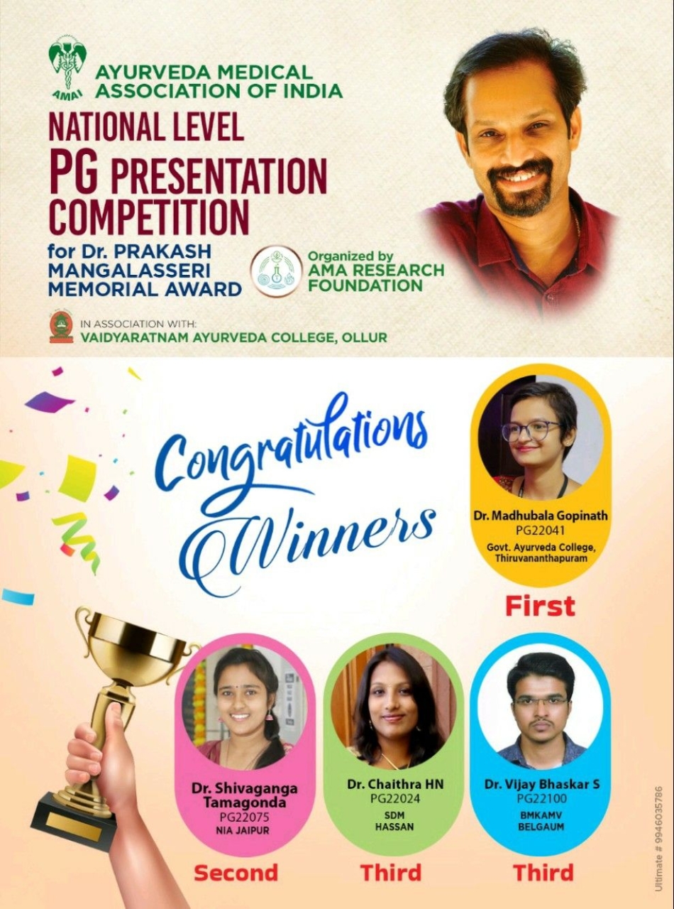 Dr Madhubala is the winner of the most prestigious Dr. Prakash Mangalassery Award. The competition was held at Vaidyaratnam Ayurveda College - India in combination with Ayurveda Medical Association of India that intends in bringing up talents and new opportunities.